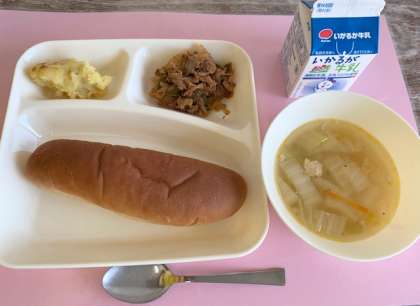 【黒糖パン、豚肉と野菜のケチャップソテー、スープ、スイートポテト、牛乳】