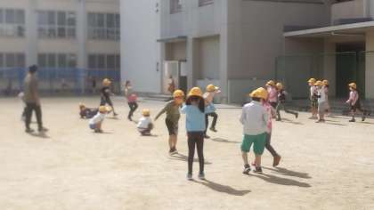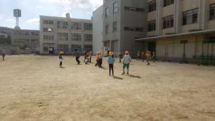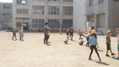外で活動するには絶好の季節です。1年2組の皆さんは、担任の先生と一緒にボール遊びをしていました。