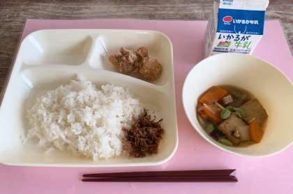 【ごはん、鶏肉のたつたあげ、あつあげと野菜の煮もの、おかかなっ葉、牛乳】