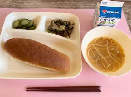 【ライ麦パン、牛肉のカレー風味焼き、ほたて貝とトマトのスープスパゲッティ、きゅうりのサラダ、牛乳】