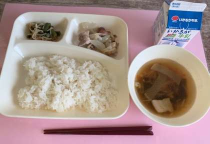 【ごはん、鶏肉のゆず塩焼き、ソーキ汁、もやしとさんどまめの甘酢あえ、牛乳】