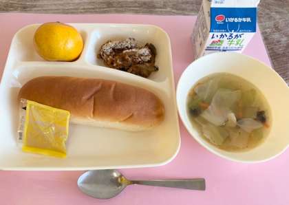 【大型コッペパン、アプリコットジャム、なすのミートグラタン、鶏肉と野菜のスープ、みかん、牛乳】