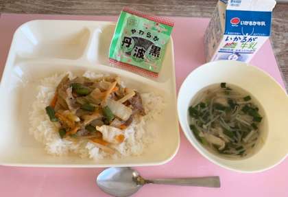 【ピリ辛丼、中華スープ、ソフト黒豆、牛乳】