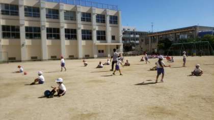 2組のみなさんはボール運動です。ペアでボールの投げ合いっこをしました。