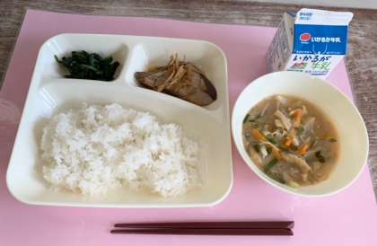 【ごはん、なまりぶしのしょうが煮、みそ汁、ほうれんそうのおひたし、牛乳】