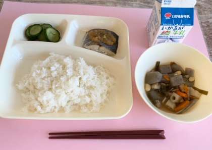 【ごはん、さごしのおろしじょうゆかけ、大豆と冬野菜の煮もの、きゅうりのしょうがづけ、牛乳】
