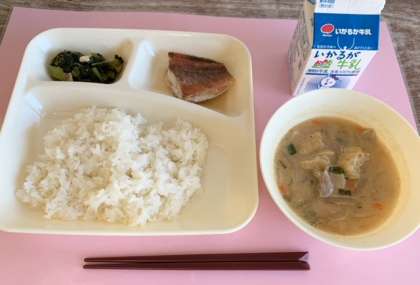 【ごはん、あかうおのしょうゆだれかけ、みそ汁、こまつなのいためもの、牛乳】