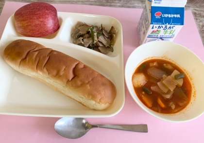 【おさつパン、豚肉のカレー風味焼き、ケチャップ煮、りんご、牛乳】