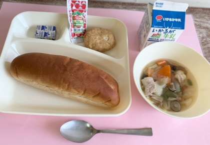 【黒糖パン、とうふハンバーグ、カリフラワーのスープ煮、固形チーズ、牛乳】