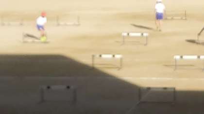 ハードル走に取り組んでいます。 どのようにしたらハードルを低く飛び越すことができるかそこがポイントですね。
