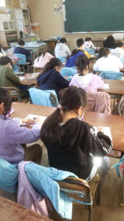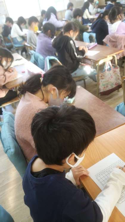 かけ算の百ます計算に取り組んでいました。2年生の終わりまでに、スラスラと九九が言えるように頑張ってね。