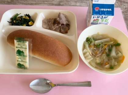 【大型コッペパン、ソフトマーガリン、豚肉のガーリック焼き、スープ、ほうれんそうのソテー、牛乳】