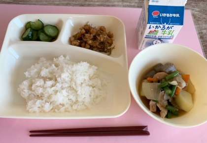 【ごはん、鶏肉と野菜の煮もの、じゃこ豆、あっさりきゅうり、牛乳】