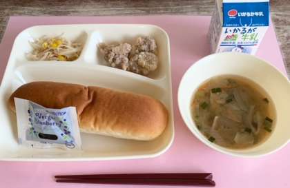 【大型コッペパン、ブルーベリージャム、鶏肉のからあげ、中華みそスープ、もやしとコーンの甘酢あえ、牛乳】