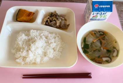 【ごはん、豚肉と干しずいきのみそ煮、すまし汁、焼きかぼちゃの甘みつかけ、牛乳】