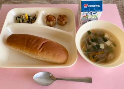 【黒糖パン、あげシューマイ、とうふのスープ、ツナとチンゲンサイのいためもの、牛乳】