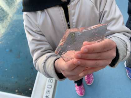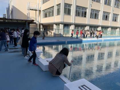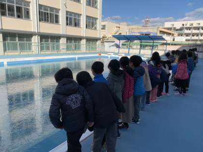今日の冷え込みで、なんと学校のプールの水が氷りました。氷の厚さは2センチメートルほどあったそうです。