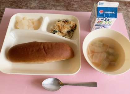 【黒糖パン、ほたて貝のグラタン、スープ、和なし(カット缶)、牛乳】