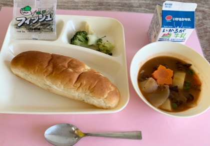 【おさつパン、ビーフシチュー、ブロッコリーのサラダ、ミニフィッシュ、牛乳】