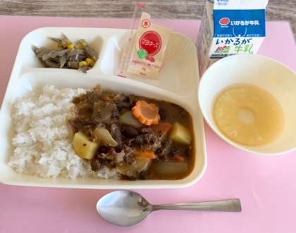 【牛肉と金時豆のカレーライス(近江牛)、ごぼうサラダ、パインアップル(缶)、牛乳】