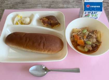 【黒糖パン、豚肉と野菜のケチャップ煮、カリフラワーのピクルス、桃のクラフティ、牛乳】