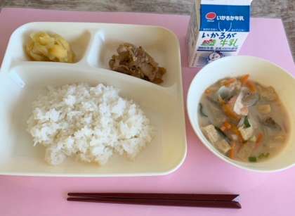 【ごはん、鶏肉の甘辛焼き、かす汁、くりきんとん、牛乳】