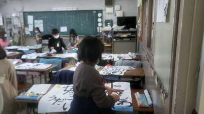 和紙に墨で名前を書いて、回りに絵の具を使って絵や模様をつけていきます。