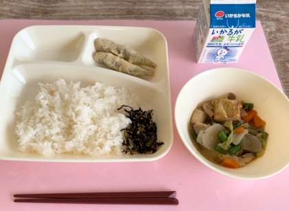 【ごはん、いわしてんぷら、あつあげと野菜の煮もの、ごまひじき、牛乳】