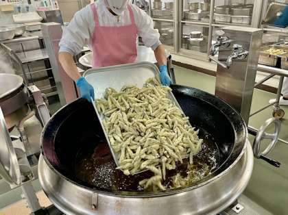 いわしてんぷらは、国産のいわしのてんぷらをなたね油であげています。衣がサクサクで、子どもたちもおいしく食べていました。(あげている様子 写真2、3枚目)
