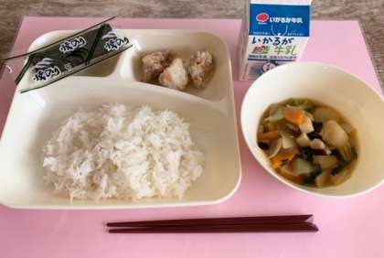 【ごはん、鶏肉のからあげ、まる天と野菜のうま煮、焼きのり、牛乳】