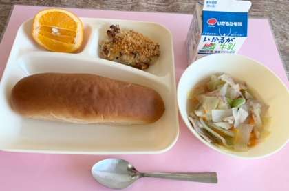 【黒糖パン、押麦のグラタン、スープ、いよかん、牛乳】
