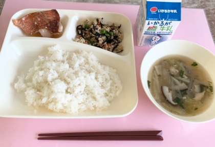 【ごはん、あかうおのレモンじょうゆかけ、うすくず汁、高野どうふのいり煮、牛乳】