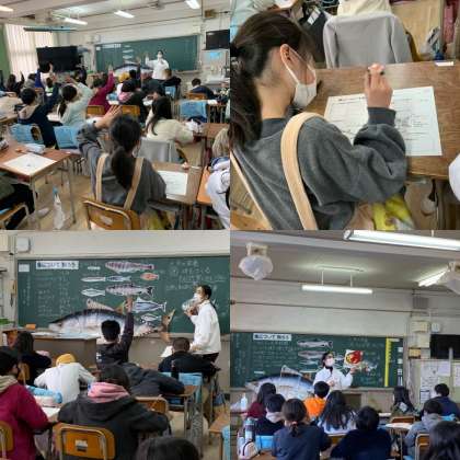 給食に出てくる魚の姿や名前、魚に含まれる栄養、魚の体のつくりとその働きを知り、「魚の苦手な部分も今度からは食べたい」「今まで意識していなかったけれど、今度から魚を食べる時には、魚の名前やどんな魚なのか考えて食べるようにしたい」などの感想が見られました。
