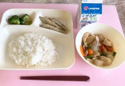 【ごはん、きびなごてんぷら、一口がんもとじゃがいもの煮もの、ブロッコリーのごまあえ、牛乳】