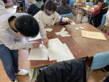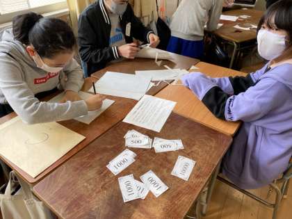 グループに分かれ、貿易ゲームに取り組んでいます。