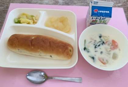 【おさつパン、ほうれんそうのクリームシチュー、キャベツのサラダ、洋なし(カット缶)、牛乳】