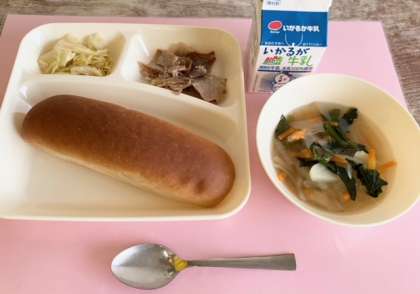 【黒糖パン、豚肉のガーリック焼き、スープ、サワーソテー、牛乳】