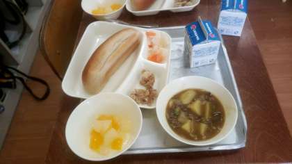 今日のメニューは、6年生の卒業を前にして「卒業お祝い献立」です。このメンバーで共に喫食するのもあと数日。本当は、みんなでおしゃべりしながら食べたいところですが…… みんな がまん、がまん