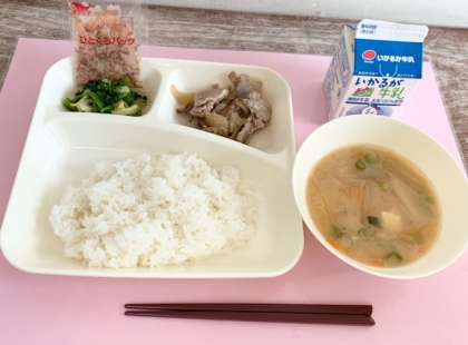 【ごはん、豚肉のしょうが焼き、とうふのみそ汁、なのはなのおひたし、牛乳】