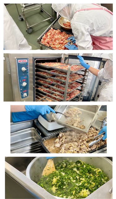 豚肉のしょうが焼きは、豚肉にしょうが汁、砂糖、料理酒、みりん、こいくちしょうゆ、綿実油で下味をつけ、たまねぎを混ぜ合わせて、焼き物機で焼いています。(写真2枚目 焼き物機に入れる前にホテルパンに並べる様子、写真3枚目 焼き物機に入れるところ、写真4枚目 焼き上がったものをほぐしながらクラスごとに配缶)