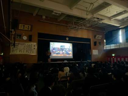 元気に101名の1年生がそろいました。まずはじめに校長先生からのお話を聞きました。次に担任の先生や主に1年生に関わる先生の紹介がありました。最後に、2年生からの歓迎の演技を動画で見ました。