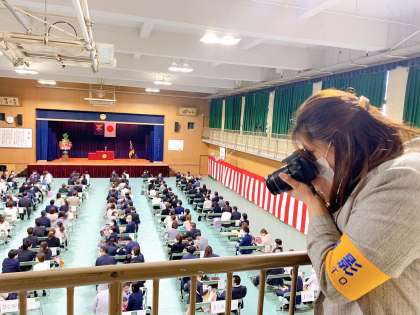 PTA実行委員の方が、入学式の様子を記録されたり、見守りのための旗を準備し、配布してくださったりもしていただきました。
