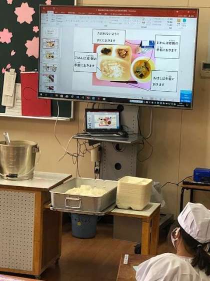 1年生も給食当番の仕事をはじめます。できるところから自分たちで準備をしていきます。