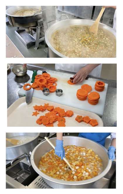 カツカレーライスは、牛肉を主材にしたカレーライスに1人1個トンカツを添えて食べます。(写真1枚目)1年生は初めての給食でしたが、上手に準備をして食べていました。「給食楽しみにしていたし、おいしい!」「学校のカレーおいしかったよ!」などの声がありました。「ラッキーにんじんが当たった!」と報告してくれる6年生もいました。(写真3枚目 ラッキーにんじんの型抜き作業)