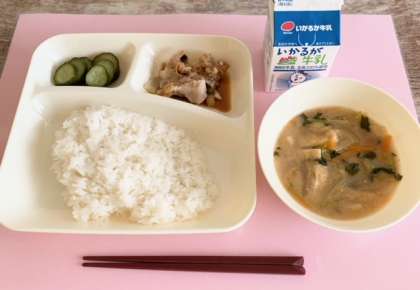 【ごはん、焼きとり、みそ汁、きゅうりのゆず風味、牛乳】