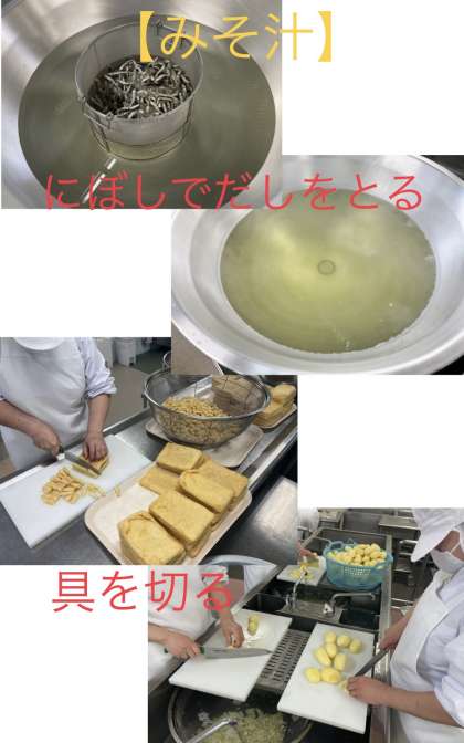 みそ汁は、にぼしでとっただしに、うすあげ、じゃがいも、たまねぎ、キャベツ、にんじん、青みにだいこん葉を使用したみそ汁です。