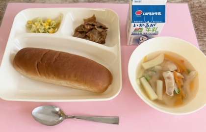 【黒糖パン、豚肉のデミグラスソース、スープ、キャベツとコーンのソテー、牛乳】