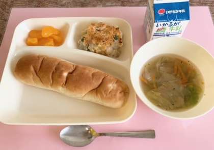 【おさつパン、マカロニグラタン、レタスのスープ、みかん(缶)、牛乳】