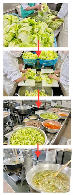 レタスのスープは、レタスの他にウインナー、にんじん、パセリを使用し、彩りよく仕上げています。(写真2〜5枚目 調理の様子)