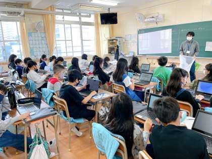 オンライン学習のためにノートパソコンを持ち帰る準備をしています。